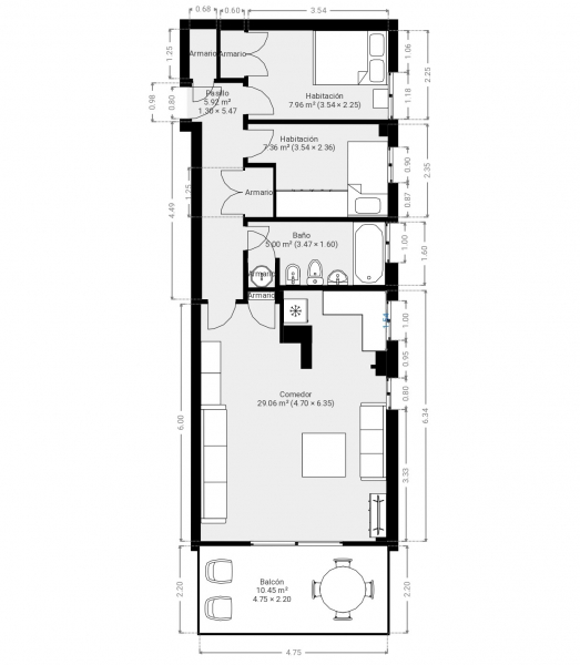Imagina despertar en tu dormitorio principal, bañado por la luz del amanecer que entra por la ventana exterior, y disfrutar de tu armario empotrado que ofrece todo el espacio que necesitas. El segundo dormitorio, también con ventana al exterior, garantiza esa luminosidad que tanto deseas. El pasillo, con dos armarios empotrados, conduce a un generoso baño con bañera, ventilación natural y un armario especialmente diseñado para la lavadora y el termo eléctrico de agua.