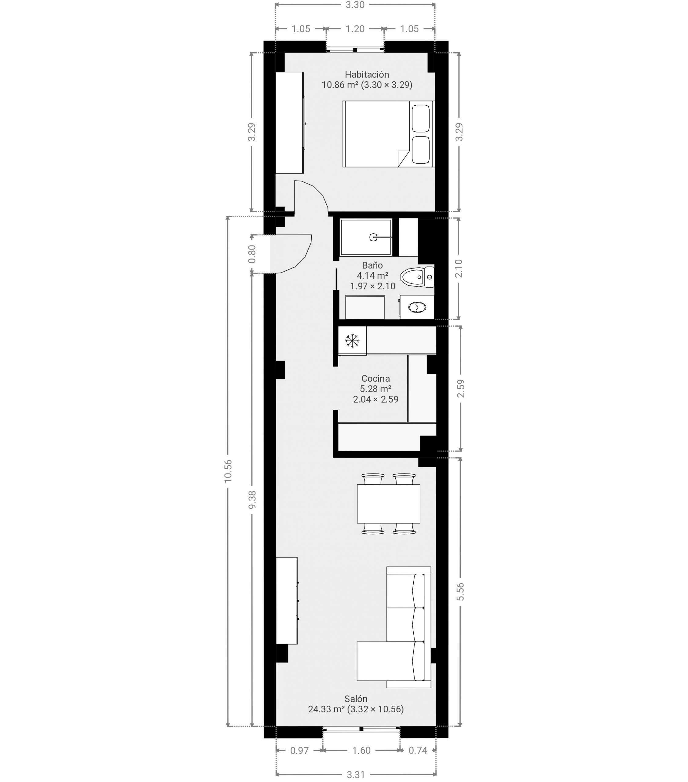 El apartamento cuenta con un luminoso dormitorio con ventana al exterior, un baño completo con moderno plato de ducha, y una cocina abierta, con barra americana, que fluye hacia un espacioso salón-comedor. Las ventanas al exterior llenan el espacio de luz natural y la eficiencia del aire acondicionado asegura un ambiente confortable en cualquier época del año. Además, el hall de entrada da la bienvenida con un cálido toque personal.